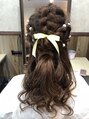 トップは大き目の編み込み、サイドはねじり編み×2本でふんわり感を出したハーフポニーです☆最近はパールアクセを編み目に差すのが流行りですね☆