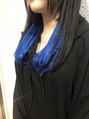 肩くらいの黒髪ボブがベースです。襟足とサイド耳上まで濃いめのブルーのエクステで、その上は地毛色に合わせて全体でシールエクステ70本を付けています。やや短め重めに切ることで馴染みをよくしています。