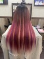 ベースが赤味しっかり系のピンク。当店には様々な同系色があるので、馴染み感がありつつ主張もしてくれる配色でメッシュデザインをエクステで☆