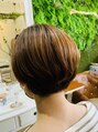ショートボブで丸みのあるスタイルですが襟足は短くすいてありますのでこれからの暑い時期でも安心です。レイヤーが入りすぎると収まりが悪く動きやすいので表面はすかずに重たさを残してあります。クセ毛のお客様ですが収まり良く仕上がりました。