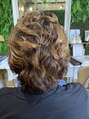 直毛のお客様で仕事中に髪が邪魔という事でカールを効かして全てリバースに細かく巻きました。手ぐしで乾かしてこれくらいなので、濡れるともう少し出るはずです。