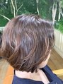 髪質が柔らかく少しうねりのある髪質です。前下がり気味の水平ボブです。前髪は長めで分けて流してあります。髪の量を調整し収まる場所と動き出す場所を作ってありますので髪質を活かしたゆるいウェーブショートボブとなります。