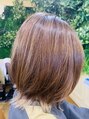 お客様ご希望のスタイルでミディアムレイヤーのスタイルです。アンダーにブリーチが入っており、丁度肩にあたり跳ねたり動きやすい長さです。カラーは全体的にシナモンベージュが入っております。