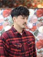 サイドから襟足にかけて刈り上げ。トップは前髪に重心を寄せてカットし、パーマでボリュームUPスッキリとして清潔感のある印象のパーマスタイルです。