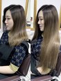 バレイヤージュを施し赤味のない外国人風に!カラーはくすみ感を強調し最新のデザインカラーを外国人風に仕上げ、当店オリジナルの人毛レミーエクステをチョイスし長さとボリューム感をだしてアレンジ多彩な万能スタイルで巻き髪スタイルを楽しめます