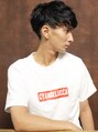 ベースは襟足とサイド短めのマッシュショート。トップにはレイヤーを多めに入れてゆるめにパーマをかけて立体感を出しています。耳上と襟足を短いツーブロックにしてあるので、すっきり感のある印象になります。