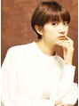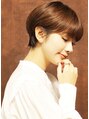 柔らかく丸みを帯びたショートヘアです。襟足はタイトにカットし、後頭部とのメリハリをつけ綺麗なフォルムに仕上げます。前髪は目の上ギリギリで