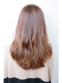 前髪は作らずセンターパートのロングカールスタイル。レイヤーはほぼ入れず、シルエットをAラインでカット。中間から毛先にゆるくパーマをかけて重たく見えがちのAラインスタイルもふわふわ軽い印象に。