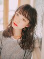 胸上レングスのIラインシルエットスタイル。ランダムに巻くことで華やかさが増します!!前髪は眉ラインのフルバングで巻くと眉が見え隠れするのが愛らしい◎カラーはぱっと見た感じ暗髪ですが光にかざすと明るくTシャツスタイルにも良し!!