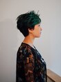 スッキリショートで横に奥行きを出すことにより、小顔効果! バングをかきあげカッコイイスタイルに! バングに鮮やかなカラーをすることでよりカッコ良く、他が締まってスタイリッシュに!くせ毛の方にもおすすめなスタイルです。