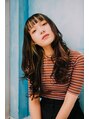 ロングスタイルの巻き髪スタイル◎切りぱなしスタイルの重めロングにした目の位置でウェーブ状にボリュームを出して巻くことでややAラインのキュートな印象のシルエットに。