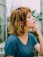 カラーはハイライトを入れたイエローベースにくすませカラーにして、前髪を短めバングにしてキュートな外国人風に◎ ゆるめのウェーブに顔周りを内巻きにスタイリングして大人カワイイボブ スタイルです♪