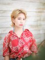 ブリーチをしてミルクティーベージュをのせ、ツヤっぽいカラーに。スタイリングした時に動きが出るようにカットで束感を作りました。襟元があいたシャツやはっきりとした色の洋服がとっても似合います。大ぶりなピアスやイヤリングをするのもおすすめです。