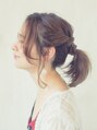 ポニーテールにみつあみをプラスして、一手間加えたアレンジです。みつあみも裏編みにして立体感を出すようにすると可愛さアップ!トップも少しずつ毛束を引き出すように遊びをつくって無造作感をプラス。ボブスタイルの方におすすめです!【稲毛】