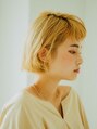 カットは、1番首が長く綺麗に見える襟足ギリギリの長さの切りっぱなしショートボブスタイル!前髪は思い切って眉上の重めスタイルで個性的な印象に。カラーリングは、ハイトーンのブロンドでスタイルの印象に軽さを出しています!【稲毛】