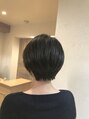 頭の丸みに沿ってボリュームを意識してカットさせていただいております。耳を出すことでよりスッキリと見え、大きめのピアスとの相性も良く、女性らしさが出ると思います。カラーはダーク系カラーで仕上げております。