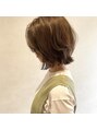 切りっぱなしボブのベースに、表面にレイヤーを入れてふんわり動きのあるボブに仕上げました。赤味が消せて透明感とほどよいくすみ感のあるオリーブグレージュがやわらかい質感にしてくれます。