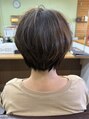 表面に軽くレイヤーをいれたショートボブのデザイン表面のレイヤーのおかげで分け目がなくなり全体的にふんわりとした印象になりヘアカラーの根元が伸びてきても目立ちにくい♪分け目無しショートはほとんどの方にオススメできるスタイルです★