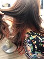 頭の下半分をブリーチします。その上からオレンジ系のカラーを塗布してクリアなオレンジに。自然に降ろした時には内側に隠れて落ち着いた印象に。巻いたりすると内側のカラーが見えてお洒落に変わります。是非、お試しください。