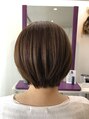 アゴくらいのボブに少しレイヤーを入れ きれいなシルエットとやわらかい感じになるようにしてみました。カラーは明るめの白髪染めです。