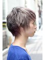 カットベースは普通のショートスタイルですが、ハイトーンのカラーリングで個性を出しています。 3回ブリーチ後、グレイアッシュをベースにピンクアッシュのポイントカラーを入れています。