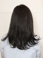 重たくなり過ぎないように毛先に少しレイヤーを入れてドライカットで量感調節。気になるグレイヘアーも明るめのカラーでしっかりとカバーしました。