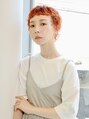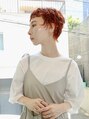 ぱっつんバングとニュアンスパーマで大人ガーリーな外国人風マッシュショート/フレンチカジュアル/ハイトーンカラー/コーラルオレンジ/デザインカラー/小顔/ウルフショート/フレンチショート/メンズライク/ハイトーンカラー/くせ毛風/小顔/伸ばしかけ/耳かけ