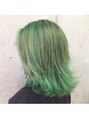 イメージチェンジにオススメのエメラルドグリーンカラー♪3回ブリーチで透明感抜群です☆夏はしっかり明るいカラーを楽しみましょう♪カラートリートメントでハッキリした発色!指名料は頂いておりませんのでお気軽にご指名ください。