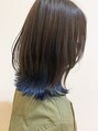 シルバーグレージュのダークトーンベースに毛先ブルーの裾カラー/切りっぱなし/外ハネ