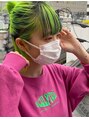 ブリーチしていてもワンカラーに飽きた方や、ブリーチを控えたい方にもオススメのあえて根本の色味を変えたルーツカラー。毛先はライムグリーンです。あえて根本は黒を残して伸びたベースを活かすのも◎根本を残すことでアレンジした時のコントラストが◎