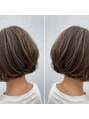 お顔のバランスに合わせてすっきりしすぎない丸みのあるボブに。質感は全体的に軽く作りオイル仕上げで毛束感ができるようにしています。カラーは以前のハイライトを活かして赤みをなくす柔らかいオリーブベージュです。