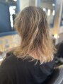 カットは全体の長さを切って毛先が軽くなりすぎないくびれボブレイヤースタイルです。ダメージのある髪質なのでパサつきが出にくくなるように質感調整しています。カラーはところどころにムラ直しとハイライトを入れて土台を作った後に淡いサワーピンクです。
