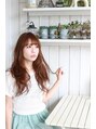 柔らか×大きめウェーブのMIXスタイル。ツヤ感をきちんと残し、女の子が好きなふんわりコテ巻きカールにしました。パーマなナチュラルセミディスタイル。甘めなバングで可愛いらしさがいっぱいです。