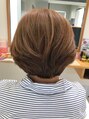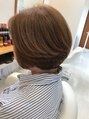 やや前下がりのグラデーションボブ。トップにレイヤーを入れてナチュラルな動きを出す。カラーはグレイカラーの一番明るいブラウン。まとまり感あるスタイルに。やわらかい髪質にツヤ感も与えました。