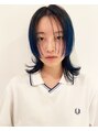 根元のブラックを生かしたブルーとのコントラストカラー顔まわりはぱつっとしたラインでモードな雰囲気をプラスしました。クールでハンサムなミディアムウルフヘアです。小林