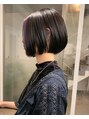 センターパートで前髪なしのボブヘア。やや前下がりのカットラインとゆる~く入れたグラデーションで収まり良くなるようにしてます。顔まわりは前髪なしだからこそのデザインカラー。薄すぎず濃すぎずのパープルがかわいいです。