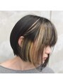 お顔周りに入れたポイントカラーハイライト。カットのデザインによってはポイントカラーの入れ方を変えてオリジナルなデザインをご提案させて頂きます。