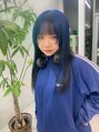 レイヤーロングにチークレイヤーをポイントで入れたシャープでクールな雰囲気に前髪で辛すぎないテーストに。カラーはブルーにインナーオフブラックのデザインカラー。