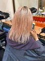 ケアブリーチで根元、中間から毛先でダメージレベルに合わせた2種類で塗り分けた後、カラーバターなどを使用し少し紫味のあるピンク系カラーに!ハイトーンカラーにきりっぱなしボブとの相性◎アイロンでストレート、コテで外ハネなど万能なボブに♪