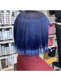 顎下ラインの切りっぱなしボブに鮮やかなネイビーを合わせたスタイル。重めの切り口ですが、ブリーチベースのカラーと合わせることで、重すぎない印象に。ブリーチ1回でもできる深めの色なので、ダメージが気になる方もぜひ相談ください!
