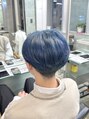 襟足を刈り上げたスッキリマッシュにネイビーを組み合わせたスタイル。サイドにもツーブロックを入れているので、横への膨らみが出づらくタイトな印象になります。色はブリーチ一回でできるネイビー。資生堂アルティストカラーで透明感のある仕上がりに。
