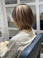 柔らかい質感の残るホワイト系カラーです。髪の毛のダメージに配慮して、可能な範囲でブリーチをします。被せる色は微々たる量の染料ですが、微妙なニュアンスを意識してカラー作りをしています。