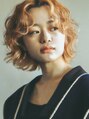 ペールオレンジのミディアム。レイヤーの入ったスタイルは癖を活かして動きのあるスタイルに。バームで毛束をしっかりと出してスタイリングするのがおすすめ。ジャケットにニットベストを合わせたモードなスタイリングに合わせて。