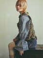 透明感のあるヌーディベージュとローライトの入ったスタイル。レイヤーの入ったシャープなショートの組み合わせ。army vest:Vintage shirt:Adam et rope skirt:TOGA