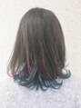 上半分のセクションは落ち着きのあるかわいい印象のピンク、えりあしインナーカラーはブルーのMIXカラー。毛先10センチに満たない部分カラーなのでまとめて隠してしまうことも可能。一工夫ある色のアソビを楽しんで♪
