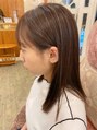 大人ハイライトを入れて、8レベルのグレージュカラーで全体にオンカラー。細いチップで上品な印象に仕上げています。ミディアムレングスにワンレングスでカット。