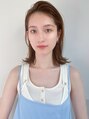 鎖骨レングスを重くなく爽やかに魅せるオールバックスタイル。スタイリングは毛先をゆるめにワンカールさせて、トリートメントバームを全体に。カラーはベージュ系で柔らかく。