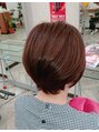 トップがふくらむようにしつつ、えりあしをスッキリさせたスタイルです少しくらいの白髪も消せる明るめのグレイカラー剤でページュ色に染めてます
