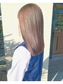 ブリーチを使った柔らかい触りたくなるような色味が得意です!ぷつんとしたライン感のカットに柔らかいグレージュの色をのせていきました