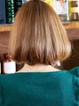 思つ見えがちのノーバングボブスタイルもハイトーンで仕上げることで軽く見え、動きが出てくれます。カットでは襟足を短めにすることではねないようにしました。[橋本駅]